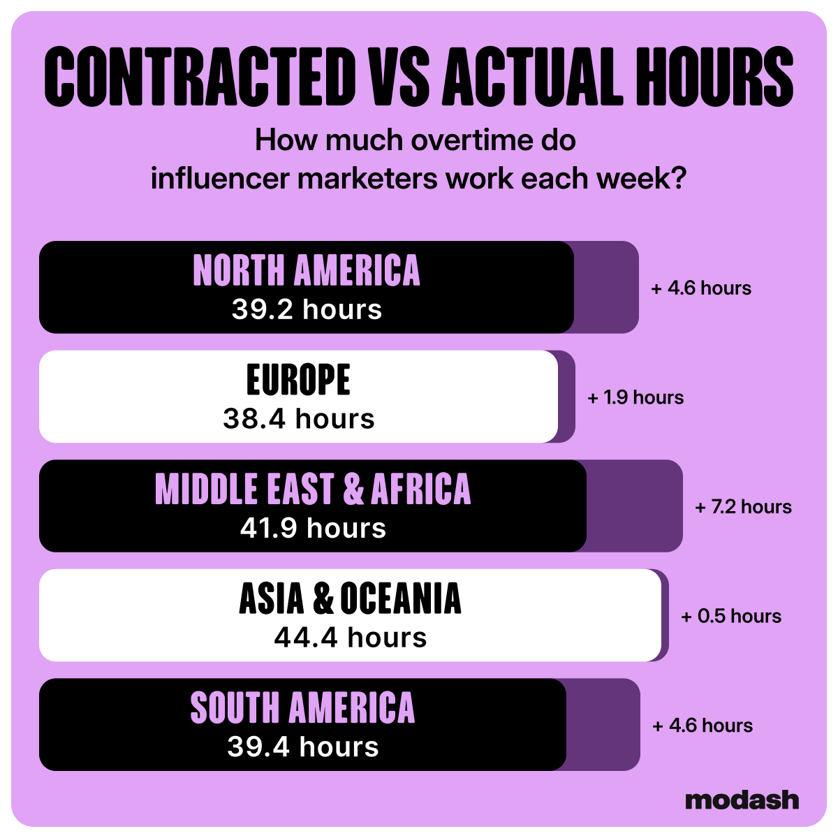 Globally, the average is 2.9 hours of unpaid overtime per week. Some regions are much worse. The Middle East & Africa clocks 7.2 extra unpaid hours, while North and South America each clock 4.6. On average, that's roughly $1,257 in lost wages per year. For North American marketers, it's over $10,000.