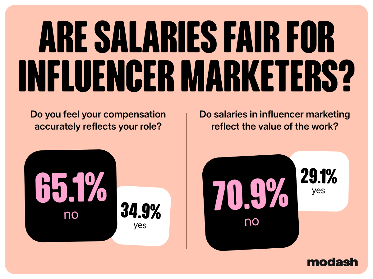 Six in 10 influencer marketers told us their salaries don't accurately reflect their roles and tasks. Seven in 10 said the industry as a whole is failing to pay marketers for the value they provide.